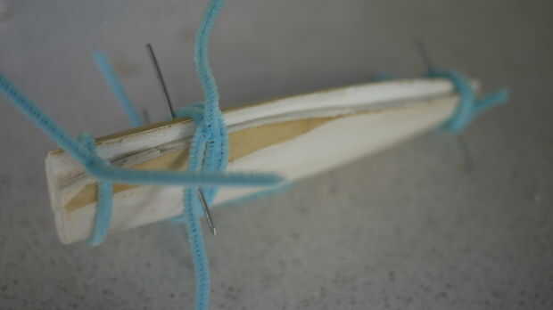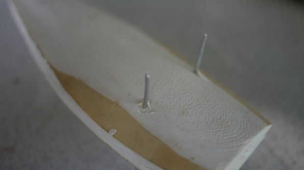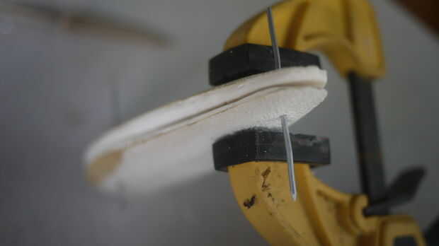 Con su forma simplemente prensado, corte un embudo en la parte superior de su molde y aplanar apagado. Con el prototipo todavía en el molde, perfore un pequeño agujero y pasar algunas espigas de colocación. Utilicé un alambre fino.
