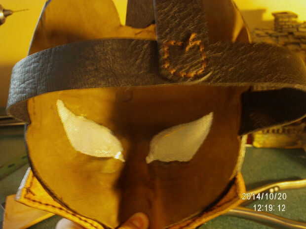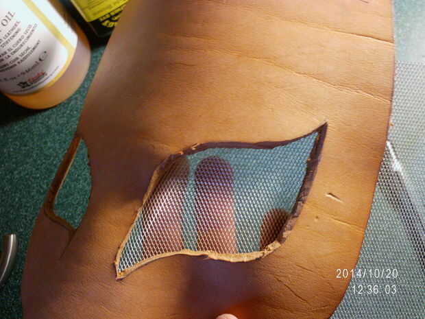 Desea que se ajuste sobre los ojos y algo por lo que se puede asegurar con alguna guarnición de cuero que cemento de contacto sobre la malla que va alrededor de los orificios de los ojos. Utilizar sólo algunos cuero forro fino en la parte posterior de mi máscara que esconde la costura para el resto de las piezas y los de malla de las piezas en su lugar, obtendrá la sensación de cuando se utiliza la malla, hay en esa caja para algunos errores así que no te preocupes. Si el diseño alrededor de los ojos requiere costura alrededor de ellos, puntada a través del acoplamiento en el otro lado, así como para la durabilidad agregada.