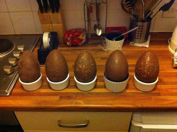 Había crecido con la idea de que para crear los huevos de Pascua, había que fundir chocolate y cepillo en capas en el molde, acumulando con el tiempo a un grosor de descenso. Aunque un gran proyecto de hobby poco para crear un puñado de huevos, esto sólo lleva mucho tiempo si usted quiere crear un gran número de ellos. También no es casi tan aventurero como quisiera!