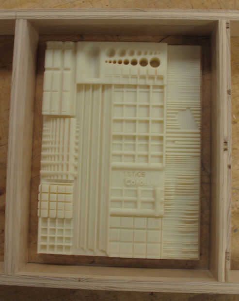 La plantilla se muestra arriba hace uso de una hoja de petg y un marco de madera. Porque el marco también debe ser impermeable, su interior ha sido capas de cinta adhesiva de empaque. Para asegurar el fácil desmontaje una vez que el yeso ha sido derramado, se lleva a cabo el marco de la plantilla junto con tornillos en lugar de pegamento o clavos.