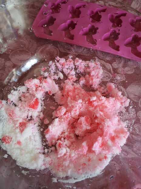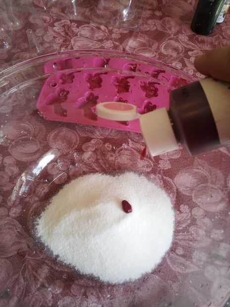 Si desea teñir el azúcar antes que moldearla, añadir el colorante el mismo tiempo cuando se agrega el agua. podrás ver pequeñas manchas de color para mezcla real bien o simplemente Asegúrese de que las manchas no van a verse en el molde.