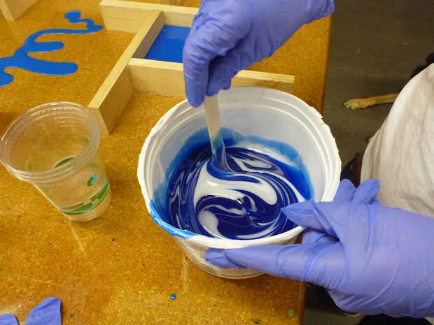 Verter uniformemente y de aproximadamente 1 pie por encima de la caja en el centro, permitiendo que la silicona fluya sobre las piezas.  Esto minimizará las burbujas.