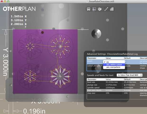 El archivo .svg para este paso elimina el detalle de su patrón de molde de copo de nieve. Estamos cortando ChocolateSnowflakeDetail.svg primero y ChocolateSnowflakePedestal.svg segundo lugar, en el siguiente paso. Esto despeja una capa de la parte superior y permite que la herramienta poder llegar a donde necesita llegar.