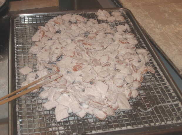 Después de la agitación, colocar el caramelo sobre una rejilla para enfriar en una bandeja de dulce. Esto le permitirá recuperar el azúcar en polvo para su uso posterior.