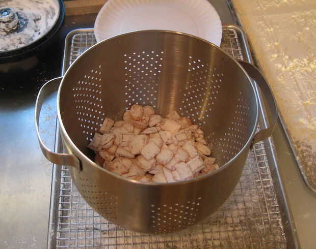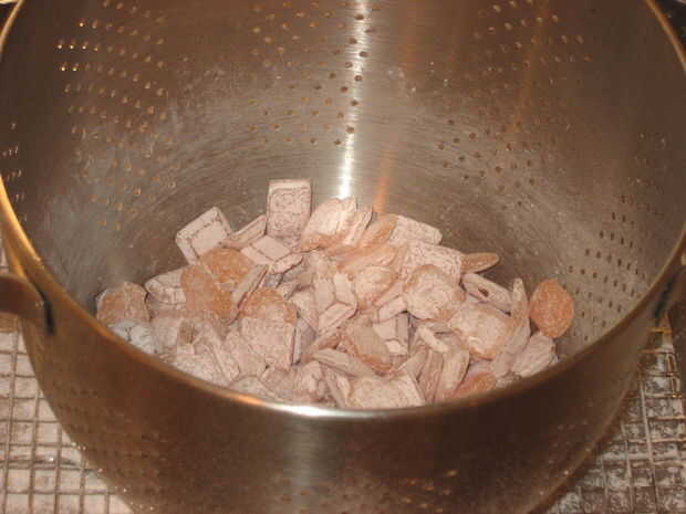 Después de golpear la mayoría del lugar del azúcar el caramelo en un colador y sacudir vigorosamente para eliminar la última cantidad de azúcar pierde. No agitar demasiado aunque ya pueden empezar a romper el caramelo.