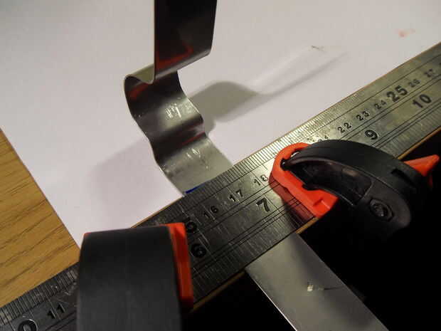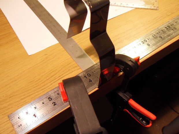 Con la parte de acero colocada correctamente, la curva contra el gobernante. La regla afianzada con abrazadera será mantener la pieza en su lugar y proporcionan una agradable tieso, recto, agudo etch para doblar el acero del molde contra.
