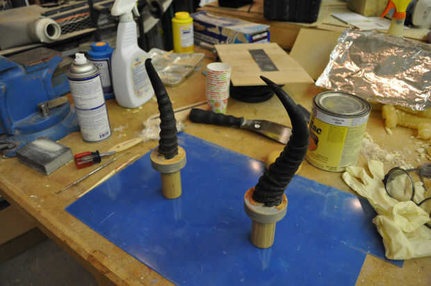 Comencé llenando mis cuernos con Cosas grandes, como puede encontrar en Home Depot, que me ayude a adherirse a mis bases de madera. Esto no es un paso totalmente necesario, pero que significaba que podría conseguir una costura muy limpia alrededor de la base. Pegan los cuernos a mis bases, que habían sido rociados con barniz claro, con pegamento caliente. Entonces pegué algunas longitudes de bambú a las espaldas de las bases para hacer un embudo a través del cual podía verter la cera una vez que los moldes fueron acabados.
