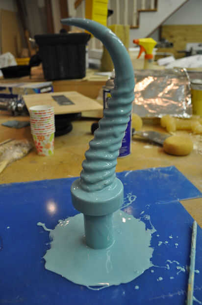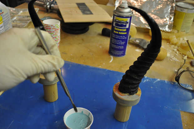 He mezclado mi silicona en un vaso pequeño según las recomendaciones del fabricante y comenzó a pintar en mis cuernos a partir de superior a inferior. Al hacer esto Asegúrese de ir lentamente y uniformemente dejando que la silicona extraer burbujas mientras que viaja hacia abajo de su modelo. Caza alrededor de su modelo de burbujas de aire que podrían han sido atrapados y ver a ellos con su cepillo. Asegúrese de que usted obtiene en cada proyección y en cada grieta. Esta capa va a contener todo su detalle. Si está llena de burbujas cada parte echaste tendremos burbujas e imperfecciones así.