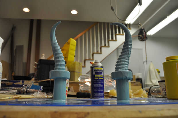 Por lo tanto, para continuar con el tutorial, nuestro modelo está en una hoja de plástico que va a capturar todos los goteos y derrames y como pintamos en nuestra primera capa de silicona. Rociar una capa de liberación en mis cuernos y se puso unos guantes de látex. Tengo un respirador bastante profesional para evitar la inhalación de humos en mi tienda. Si no tienes uno asegurarse de que su espacio de trabajo está especialmente bien ventiladas antes de abrir su silicona. No es enormemente tóxico, pero no es algo que quiere ser respirar durante horas.