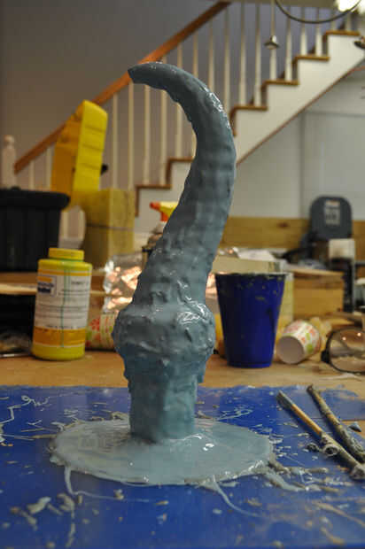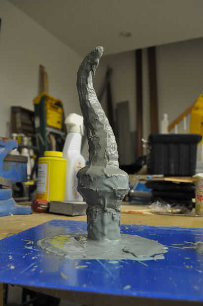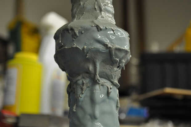 La silicona que utiliza, el OOMOO 30, tarda aproximadamente una hora para configurar. He intentado poner en una capa cada hora hasta que hubo por lo menos 3/16" todo el camino alrededor de mi modelo. También me aseguré de ampliar el anillo de silicona alrededor de la base a por lo menos 2". En ese momento dejé curar durante la noche.