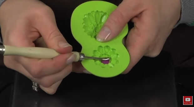 Con la herramienta de arcilla, paquete de la arcilla hacia abajo y empuje firmemente en los bordes del molde para que la arcilla llena completamente el contorno de la primera piedra preciosa. Una vez que la arcilla está embalada hacia abajo, puede que necesite añadir un poco más para nivelar la arcilla con el contorno de la piedra preciosa.