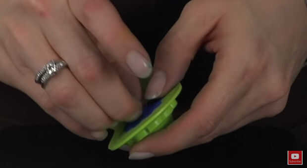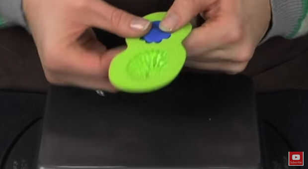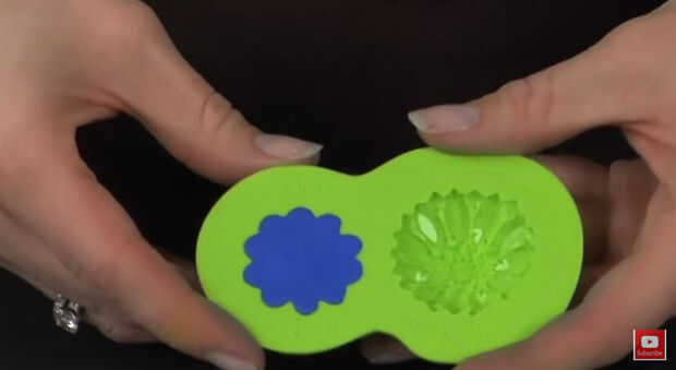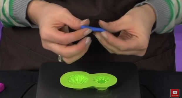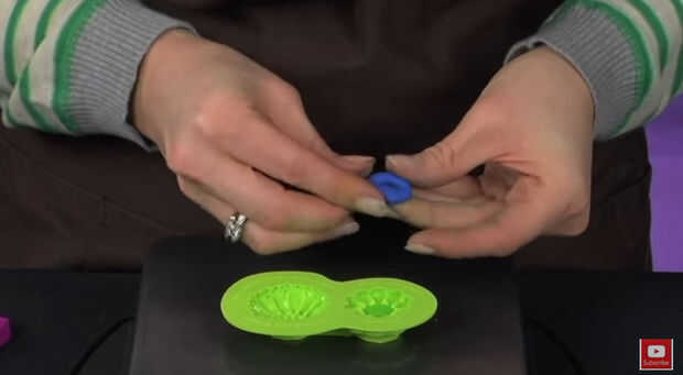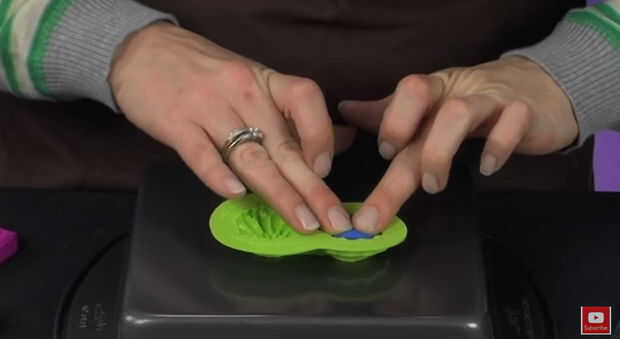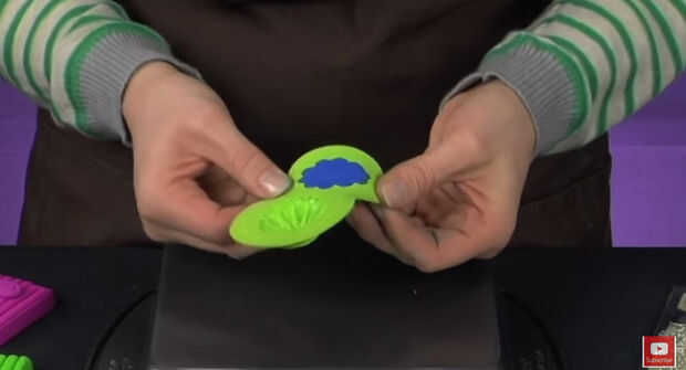 Con el tercer color de arcilla, amase un pedazo más grande. Rodar en una salchicha y luego formar un anillo de la salchicha. Presione el anillo de arcilla en el molde, empujando hacia los bordes fuera del molde. Una vez más, utilice la herramienta de arcilla para asistirlo en conseguir la arcilla en todos los bordes del molde. Añadir más arcilla para hacer la parte de atrás del nivel del molde. Si se agrega demasiado, puede pellizcar la parte sobrante y luego nivelar la arcilla. Una vez nivelado, afloje la arcilla del molde los lados del molde hacia abajo. Una vez que la arcilla ha sido libertada de todos los lados, doblar el molde nuevamente y permita que la arcilla pop out.
