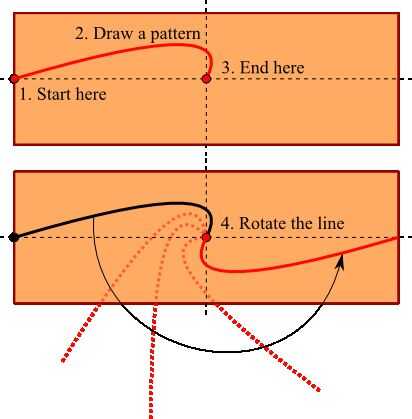 Ahora mueva eso patrón de la mitad de 180° con el centro de su área de trabajo como el centro de la rotación. Realmente la imagen de arriba explica mucho mejor de lo que pueda.