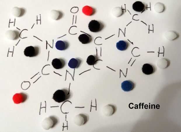 - La cafeína tiene 19 bonos 8 bolas negro (carbón), 2 bolas rojas (oxígeno), 10 bolas blancas (hidrógeno) y 4 bolas azules (nitrógeno)