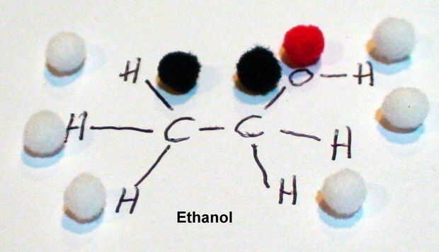 - Etanol tiene bonos de 8, 2 bolas negras (carbón), 1 bola roja (oxígeno) y 6 bolas blancas (hidrógeno)