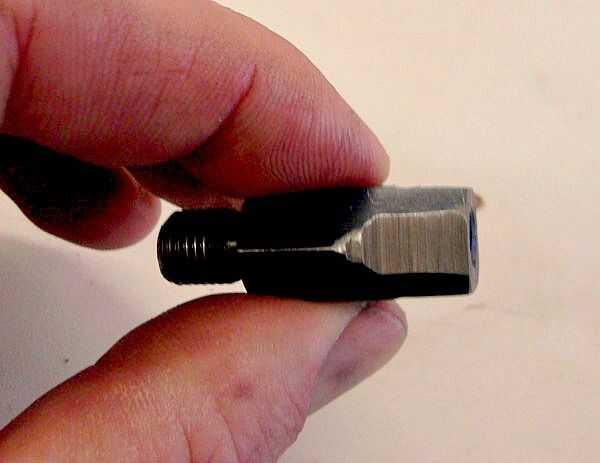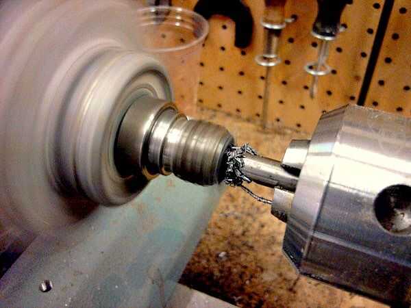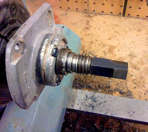 Tuve un accesorio de taladro roscado que yo suelo cuadrado en un extremo para caber en el mezclador. El otro extremo tenía un hilo de rosca masculino perforado y golpeado ligeramente un agujero en el eje de la amoladora para acomodarlo. No tengo un torno de metal pero mi amigo tiene un torno de madera que funcionaba muy bien para esto.