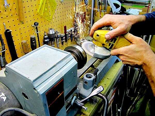 Comencé cortando la brida hacia abajo con una tronzadora para corte de metales hasta que tuve un cuadrado del tamaño que necesitaba. Me esta había montado en el torno y tomó una amoladora a él hasta que tuve una aproximación de una brida circular que coincidió con la amoladora. Todavía tenía esa mirada hecha a mano, pero está bien.