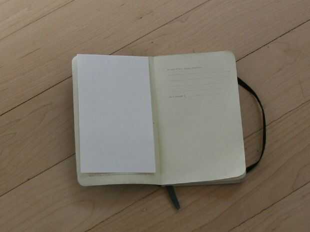 Teniendo una tarjeta de índice, alinee la parte superior de la tarjeta para que quede al ras con la parte superior de la cubierta de Moleskine. Sugiero centrar la tarjeta de índice muy ligeramente a la izquierda del centro de la cubierta de la Moleskine, como se muestra en la imagen.