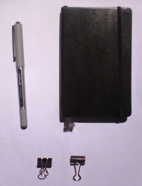 Necesitarás dos binder clips, cada uno el tipo pequeño, una Moleskine o cuaderno y una pluma de su elección.
