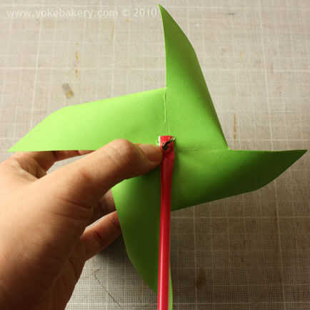 Colocar paja a pinwheel colocando el agujero en la paja a través de papel de pin en la parte posterior de la rueda.