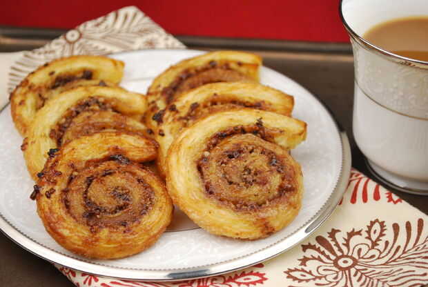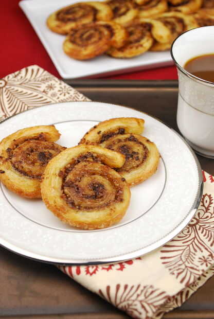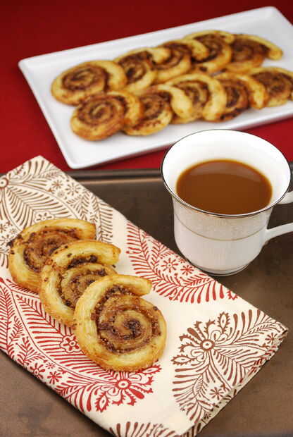 Cuando el almíbar esté frío, coloque una lámina de hojaldre sobre una tabla de cortar. Espolvorea 2 cucharadas de azúcar sobre toda la hoja. Con un rodillo, estire la masa ligeramente en todas direcciones, presionando el azúcar (y mantenimiento de la forma rectangular). Voltee la masa.