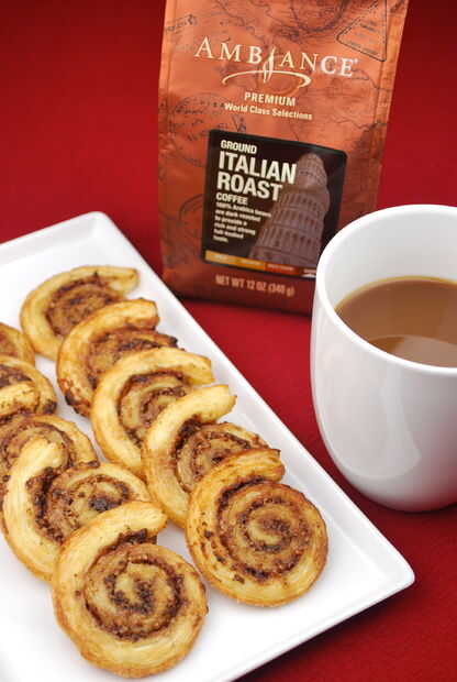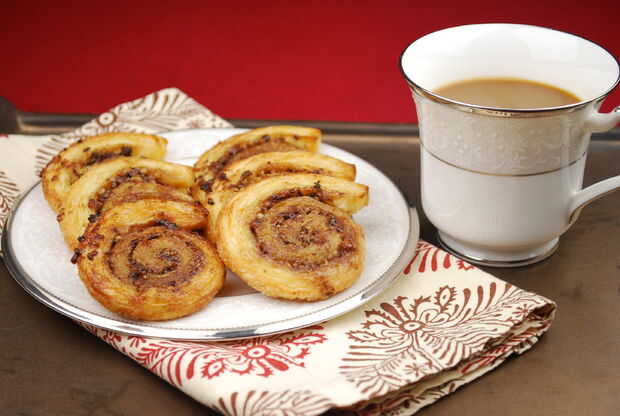 Con un pincel de repostería, liberalmente capa de pastel con jarabe de café. Espolvorear 1 cucharada de azúcar, mitad el chocolate picado y la mitad de las nueces picadas sobre el almíbar, dejando un borde de 1/2" en un lado de la pasty. Distribuidos uniformemente. Con tus manos, pulsa en pastelería.