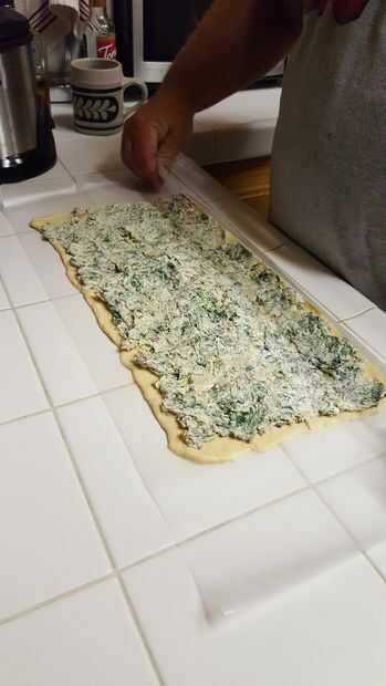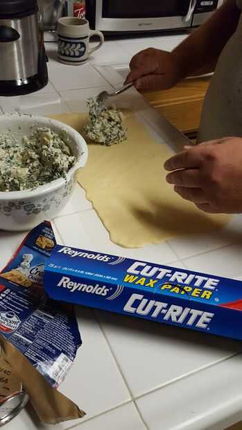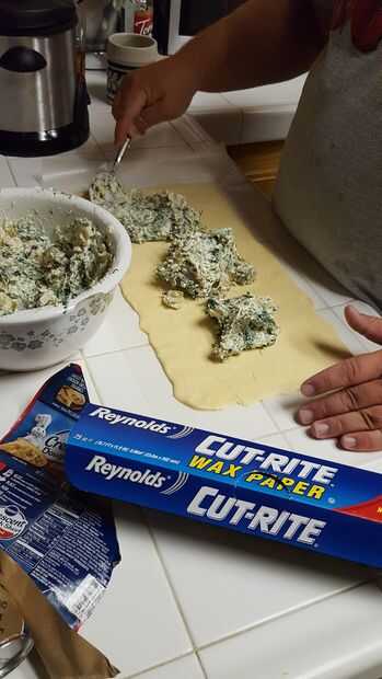 En primer lugar, coloque una hoja de papel encerado sobre un pie y medio de largo. A continuación, extienda una lámina de masa de hojaldre y pizca cualquiera parece o todo. Estirar la masa. Se puede utilizar un perno de balanceo, pero lo hago a mano para evitar la necesidad de harina. Finalmente la mitad de la mezcla sobre la masa de la pasta de la cuchara y empezar a separarse utilizando una cucharada grande. Si usted pone en gruesa como yo, tendrás suficiente para 2 rollos (por lo tanto los dos paquetes de la pastelería). Sin embargo, si se separan disolvente, puede obtener 3 rollos fuera de él.
