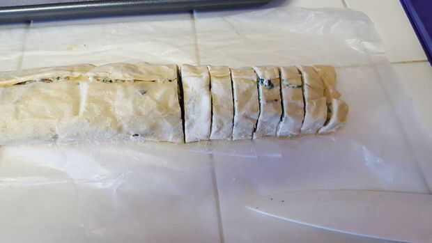 Desenrolle el papel encerado y empezar a cortar sus rollos. Generalmente hago aproximadamente la mitad una pulgada en la mía. Cortes más delgados se cocinarán más rápido, así que siéntase libres de experimentar. Coloque las rebanadas en una bandeja con spray o con papel aluminio de cocina y de cocina en aerosol. Una vez que el horno se hace lugar de calentamiento en el horno en el estante del medio y cocine durante 15 minutos. Usted puede hacer más en una vez, pero usted necesitará girar y constantemente les importa.