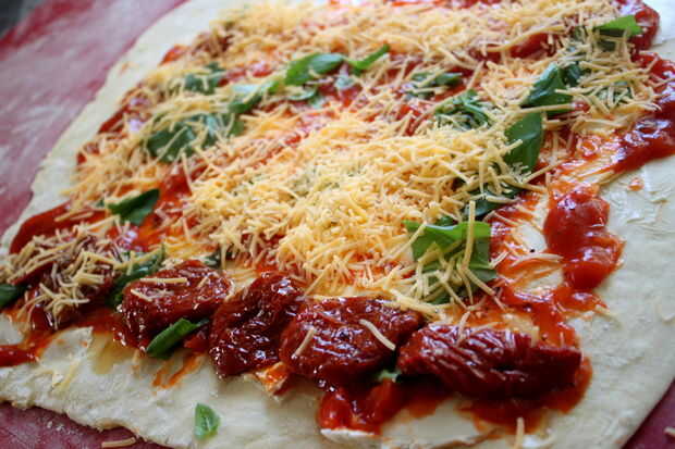 Para aprox. 24 piezas: 500 g masa hojaldre, desplegado a aprox. 20/50 cm 1 vaso salsa de tomate 1/2 manojo de hojas de albahaca 200 g de queso crema 1/2 vaso de tomates secos en aceite de oliva 25 g de queso rallado