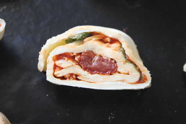 Ahora agregue los tomates secos en una línea en un extremo de la masa y enrollar la masa de ese fin.