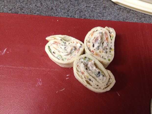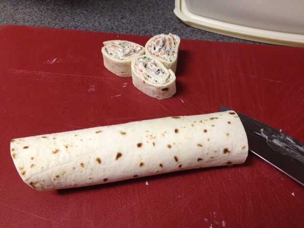 Quitar la cáscara de tortilla enrollada de la nevera y con un cuchillo afilado cortar aproximadamente 1" rodajas gruesas. Véase, molinetes poco. Trate de no comerlas todos mientras avanzas a lo largo de!