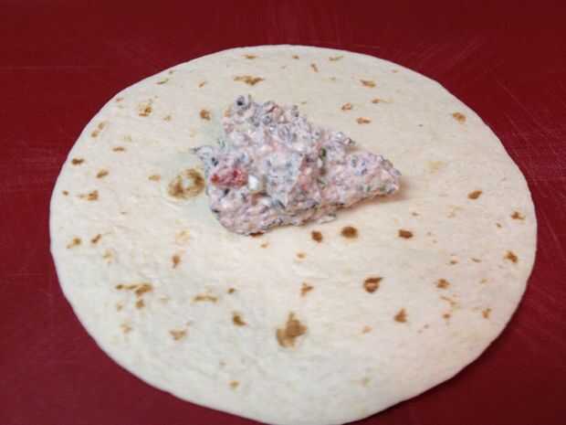 De la cuchara hacia fuera unas 3 cucharadas de la mezcla en una concha de tortilla.