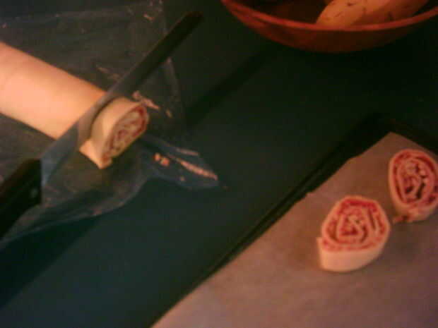 Suavemente utiliza un cuchillo afilado (usé un cuchillo de pan y un cuchillo de filete, tuvieron resultados similares.) cortar aproximadamente 1cm del rollo. Pone de lado en la bandeja y hornear hasta que estén doradas.