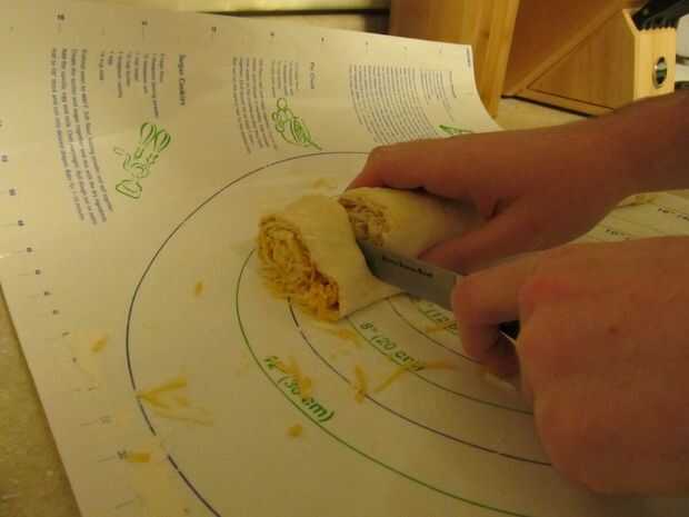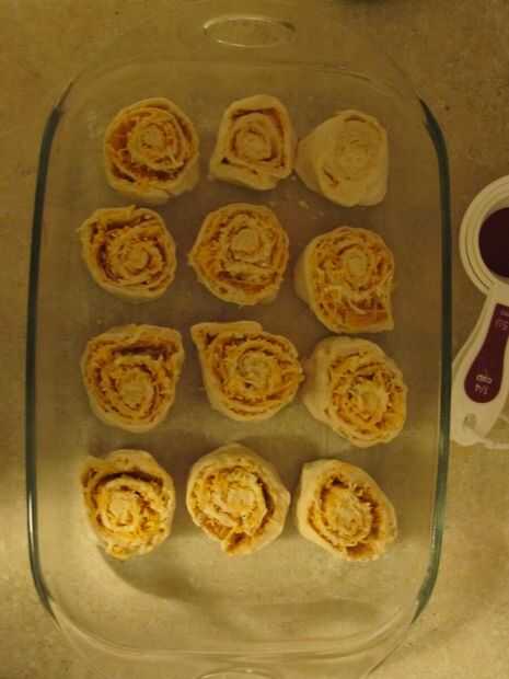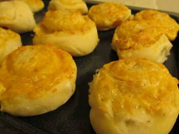 Una vez que se rueda el registro, utilice un cuchillo muy afilado para deslizar el registro en rondas de una pulgada de grosor o menos. Una vez más, dependiendo del gusto personal. Tenga en cuenta que los rollos se ampliarán más adelante. 3/4 una pulgada está probablemente bien. Coloque los rollos en una pastel cacerola de 9 "x 13" que ha sido ligeramente engrasada. Cubrir con una lámina de plástico y Deje levar nuevamente mientras precalentar el horno a 375 grados. Una vez que el horno esté a temperatura hornear los rollos durante 20 minutos, girándolas una vez alrededor de la mitad camino a través. Si salen ligeramente doradas con queso derretido en la parte superior y suave al tacto.