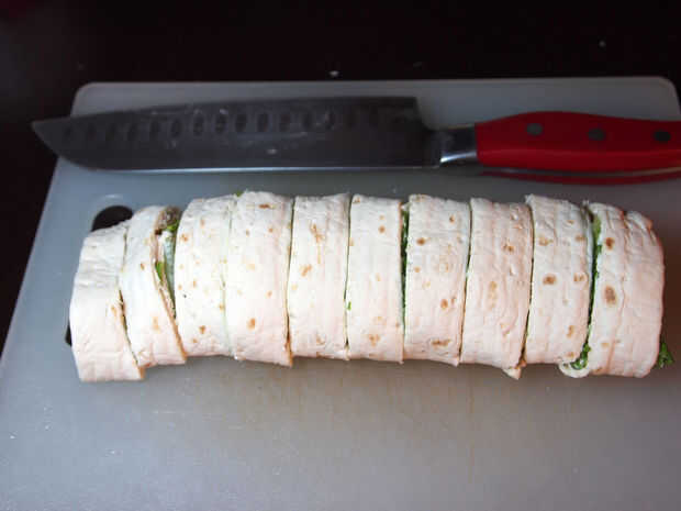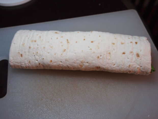 Plegar el molinete bien sobre sí mismo dos veces. Luego, puede agregar más ingredientes. Añadir un poco más de carne y un montón de lechuga. Si usted escatima hacia fuera en la lechuga, le gusto demasiado seco. Esto le da algunas gran textura y crunch! Acabado de doblar hasta el final.