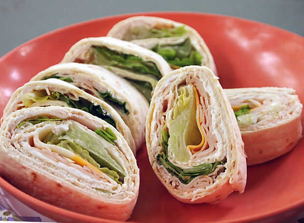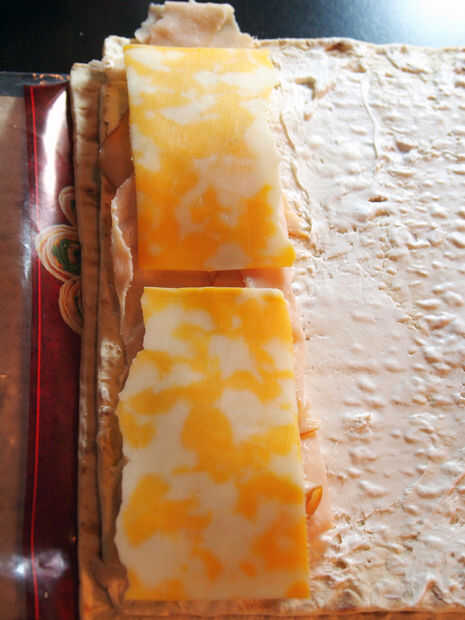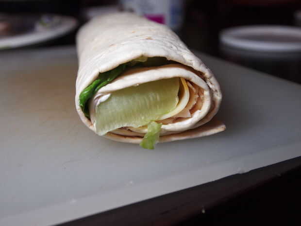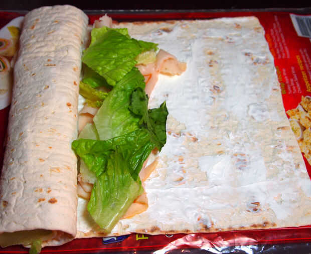 Añadir una capa poco agradable de la carne de almuerzo en el borde izquierdo de su pan plano. Trate de mantenerlo dentro de 3 a 4 pulgadas del borde. Luego poner encima lechuga y queso para rematar.