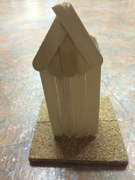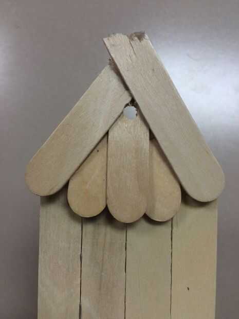 Cortando los palillos con unas tijeras, unir las piezas para hacer un pico para la casa. Asegúrese de llenar los espacios vacíos con palillos en un patrón deseado. Asegúrese de que se trata de una sola pieza cuando pegan para ser lo suficientemente robustos para soportar al giro del molino de viento.
