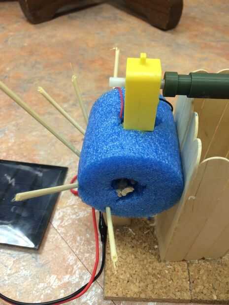 El motor en la pieza de tallarines de la espuma y la pieza entera en la varilla de madera.