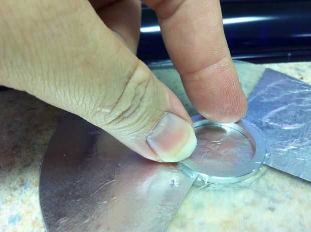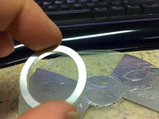 Ahora tenemos que construir nuestro obturador giratorio. Esta parte gira mientras la tierra y bloquea el campo exterior se mide la carga de la placa que recoge.  Lo primero que tenemos que hacer es asegurarse de que tanto las persianas metálicas del segundo CD electricly están conectadas unos a otros y una forma de drenar la carga de cualquier de ellos. para esto vamos a usar los anillos de metal y los discos del disco duro viejo. Coloque el anillo metálico de la unidad en el centro del disco del rotor. Teniendo cuidado de asegurarse de que se centra lo mejor posible. También asegúrese de que hace buen contacto con el aluminio de obturadores de la hoja. Presione el anillo y pegamento caliente en puntos todo el interior del anillo. Pone pegamento caliente en el anillo. Necesitamos tocar metal a metal con la lámina!