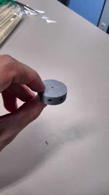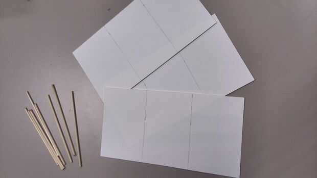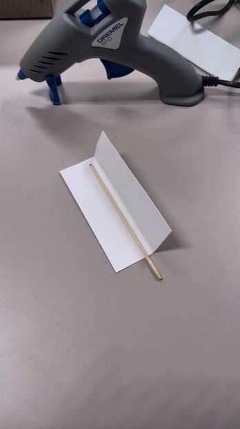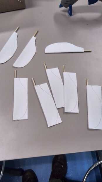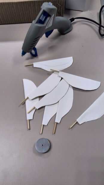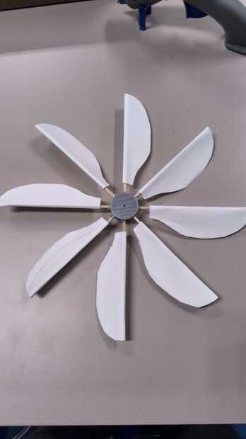 Para lograr nuestra configuración, cortamos cada palo de madera en 2 usando la pinza de corte. Los extremos afilados de los pinchos fueron cortados así como para evitar cualquier daño. Usando el papel de Steinbach, hicimos un total de ocho rectángulos de 7cmx12cm. Cada papel se dobla entonces en dos y un pincho de corte entonces fue pegado en el centro del pliegue. Los dos pliegues de cada rectángulos pegados juntos y cortar según el diseño de la imagen. Una vez que las láminas fueron acabadas, fueron insertados en la pieza de conexión impresa 3D. A veces fue agregado un punto de pegamento en el extremo de los palillos para asegurar la conexión.