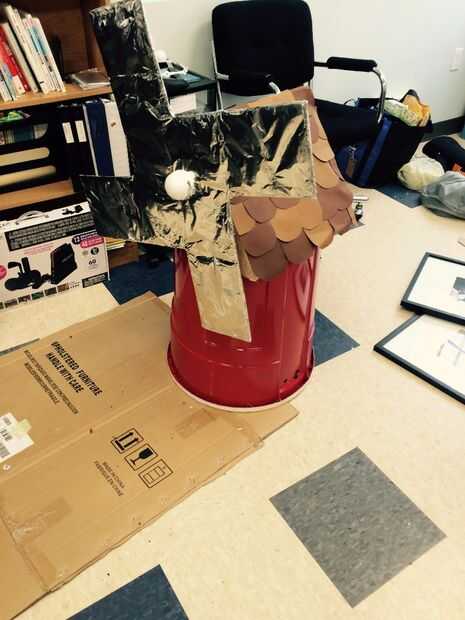 Cortar una gran bola de espuma de poliestireno por la mitad y pegamento caliente la bola en el extremo del tubo de cartón.