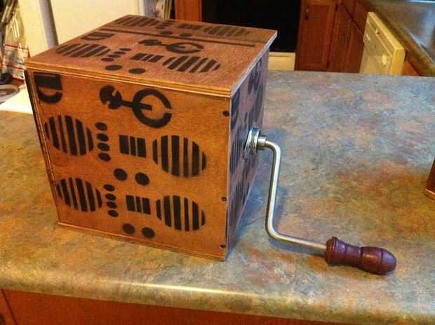 Para la manivela simplemente doblar una varilla de acero de 1/2", se volvió una tapa de madera de corazón púrpura y bofetada en. Perforó un agujero en el lado de la caja grande, agrega un cojinete sobre la misma para sostener la barra y atornillados todos juntos.