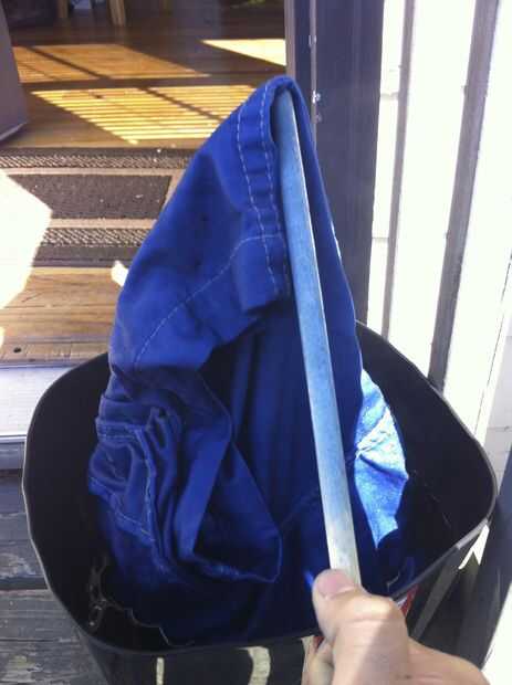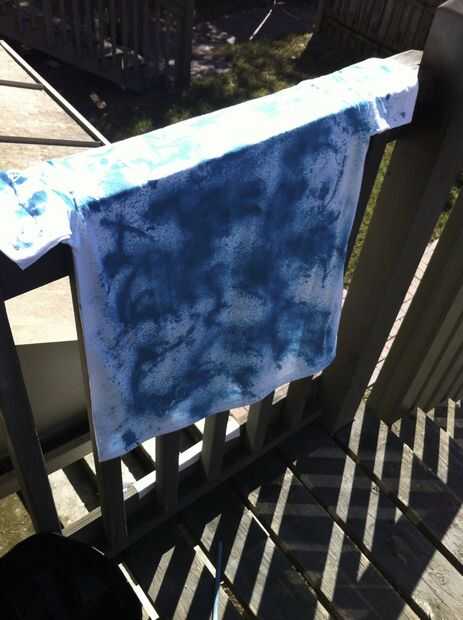 Utilicé un viejo par de pantalones cortos y sumergido en un tinte azul, en cuanto a la camisa vierte algunos de colorante azul en una botella de spray y rocía al azar para conseguir el efecto que quería.