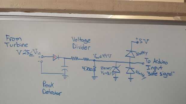 La Idea es proteger el circuito de tensiones negativas y tensiones superiores a 5 voltios. Estamos utilizando la entrada A_0 en Arduino que sólo puede manejar hasta 5 voltios. El divisor del voltaje asegura la tensión es caminó y schottky los diodos zener servir como protección suplementaria. Uno de los diodos de schottky conduce a baja para evitar la tensión negativa de llegar a los pines de Arduino. El cuadro con la turbina de viento es demostrar cómo se integran los cables de la turbina con el circuito, no es el circuito completo. El cuadro sin la turbina es el circuito completo. También se adjunta, es un diagrama de Fritzing con partes precisas para una mejor comprensión del circuito.