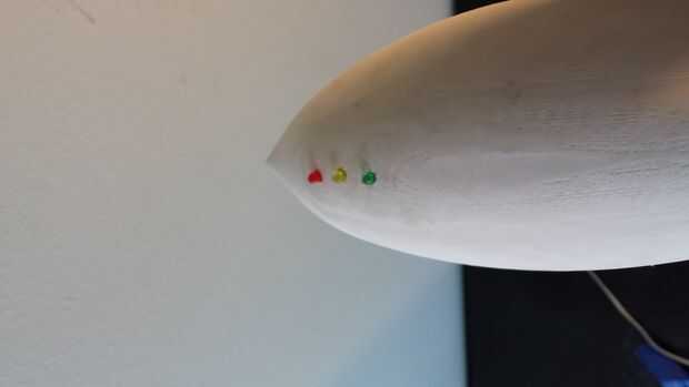 La carcasa de la turbina tiene 3 agujeros perforados en una línea que contienen los LEDs. Para reducir el cableado, soldar los pines de tierra LED juntos así que podría correr un cable a tierra hacia abajo para los LEDs, entonces los cables verdes y rojo son de la turbina. Los LED fueron movidos a su posición y entonces sujetados en su lugar con epoxi. La turbina se mantiene pulsado hasta el fondo de la vivienda con una amarra de servicio pesado y entonces siliconada en su posición de reposo final. Puedes ver cómo se orientan los engranajes en la caja en la foto de arriba; se ajustaron en su lugar como el servo (ser generoso cuando epoxying su servo experimentará un montón de esfuerzo de torsión). Una vez que has instalado todo, cuidadosamente-amarra los cables en un filamento uniforme apretado. Ejecute esta línea de alambre a través del segundo agujero en la carcasa del servo, a continuación, tire de la hebra que cuelga suelto en la parte inferior de la sección de la torre
