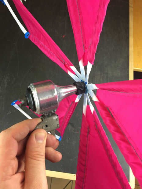 Cuando tuvimos las cuchillas de molino luego utilizamos la pistola encoladora para pegar sobre la dinamo. También puede atornillar en un pedazo de madera o cualquier otro objeto donde desea colocarlo.