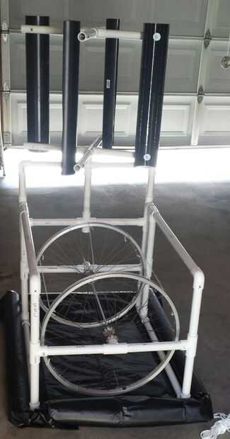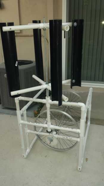 "Los rodamientos que utilicé fueron rodamientos de 1 3/8" y 5/8" tornillo y 5/8 collares para sujetar los piñones a así como la rotación compensación y láminas. Las hojas fueron hechas por corte 4" PVC a la mitad y colocar el tornillo con tubo de PVC de 1" y cuatro conexiones de manera. Ruedas dentadas fueron un diente 42 bici de un niño y un 11 he comprado de una tienda de scooter (Asegúrese de que los piñones sin embargo son el mismo tipo de cadena). Barril giratorio está hecho de PVC de 1" con tela metálica envuelta alrededor de él. Para celebrar todos juntos yo uso metal tornillos autorroscantes para poder llevarlo aparte y guardarla."