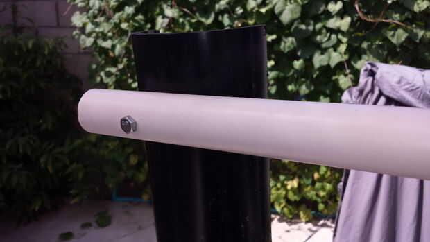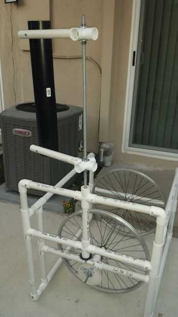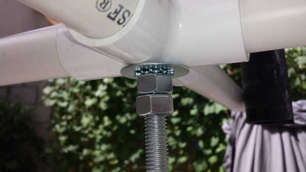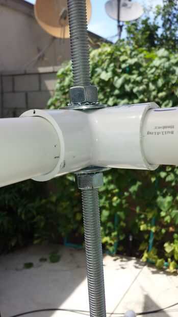Inserte los tubos de PVC parte superior de las hojas en la segunda cruz. Ajuste la altura de la parte inferior transversal utilizando los 2 conjuntos de tuercas y arandelas colocando en su lugar. La distancia entre los centros verticales de las cruces es igual a la distancia entre los orificios de la tubería ABS. Si usted mide correcto, debe ser unos 20" aparte.