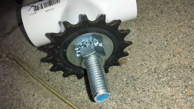 La moto que usaba tenía grandes agujeros en los piñones, así que tuve que improvisar. Tomé los piñones a Home Depot y encontró las arandelas planas que cabrían perfectamente dentro de los agujeros (o ligeramente más grande), teniendo el diámetro correcto ellos mismos para encajar en el eje.