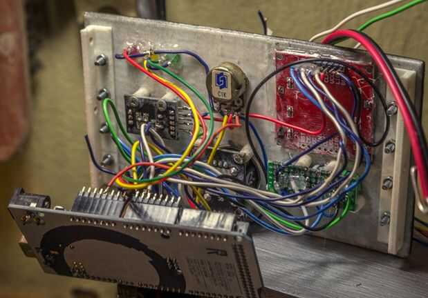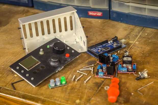 Imprimí el caso del controlador y había montado en el codificador, el joystick, el potenciómetro, la pantalla LCD, algunos LEDs y botones en la placa frontal. En el interior montara el Arduino Mega, los controladores paso a paso y un controlador poco huso casero.